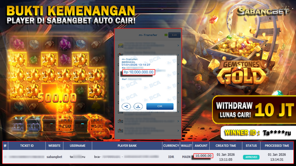 BUKTI KEMENANGAN 01 JANUARI 2026 DI GAME Gemstones Gold WD 10 JUTA