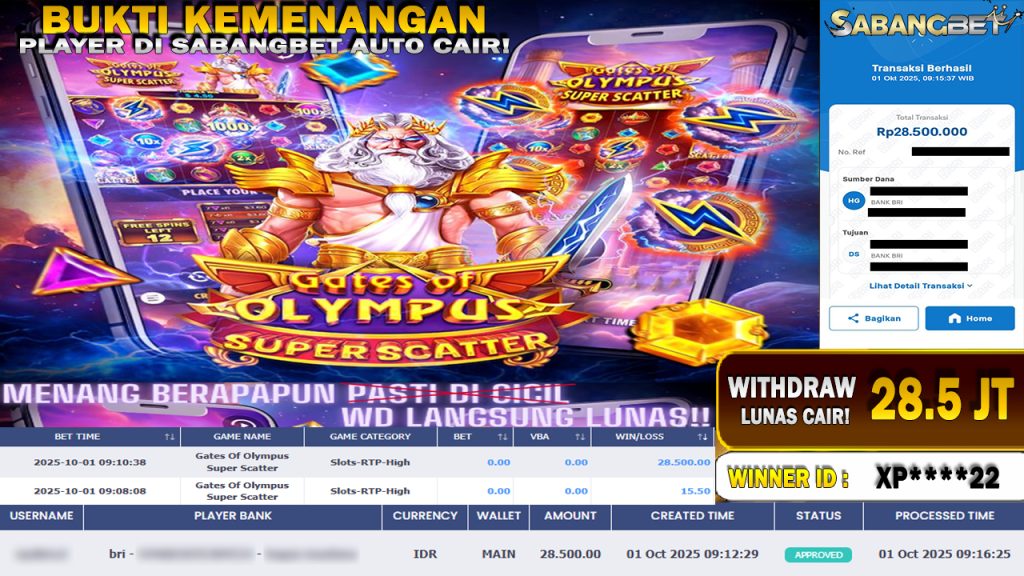 BUKTI KEMENANGAN 01 OKTOBER 2025 DI GAME Gates Of Olympus Super Scatter WD 28.5 JUTA
