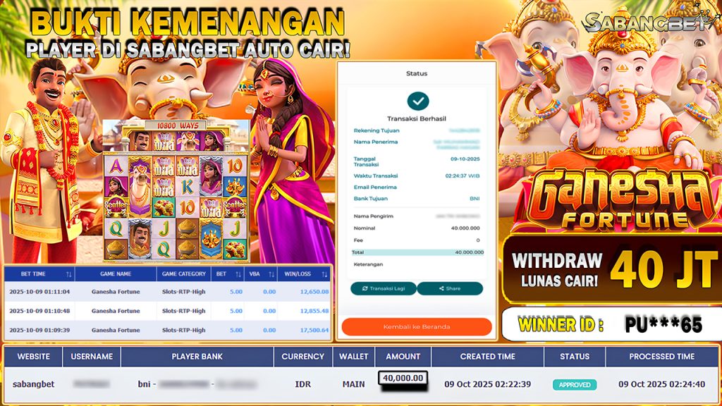BUKTI KEMENANGAN 09 OKTOBER 2025 DI GAME GANESHA FORTUNE WD 40 JUTA