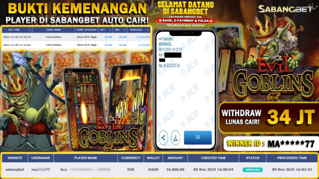 BUKTI KEMENANGAN 09 NOVEMBER 2025 DI GAME EVIL GOBLINS WD 34 JUTA