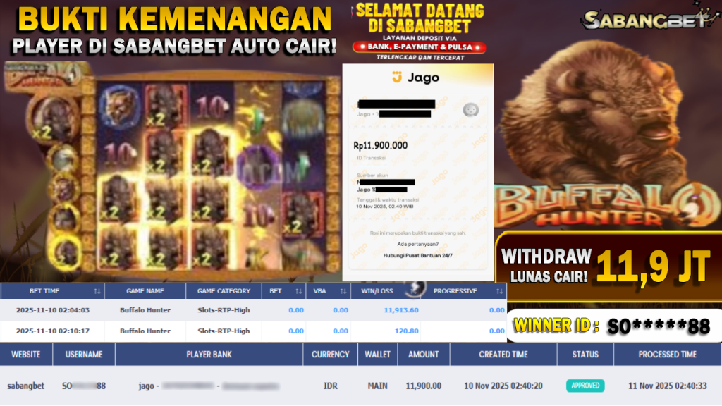 BUKTI KEMENANGAN 10 NOVEMBER 2025 DI GAME BUFFALO HUNTER WD 11,9 JUTA