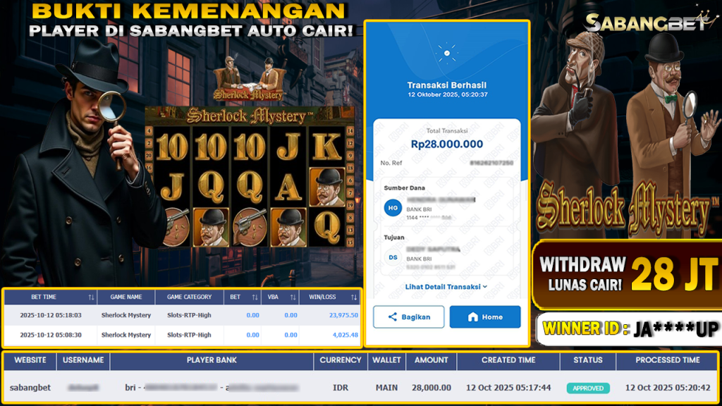 BUKTI KEMENANGAN 12 OKTOBER 2025 DI GAME SHERLOCK MYSTERY WD 28 JUTA