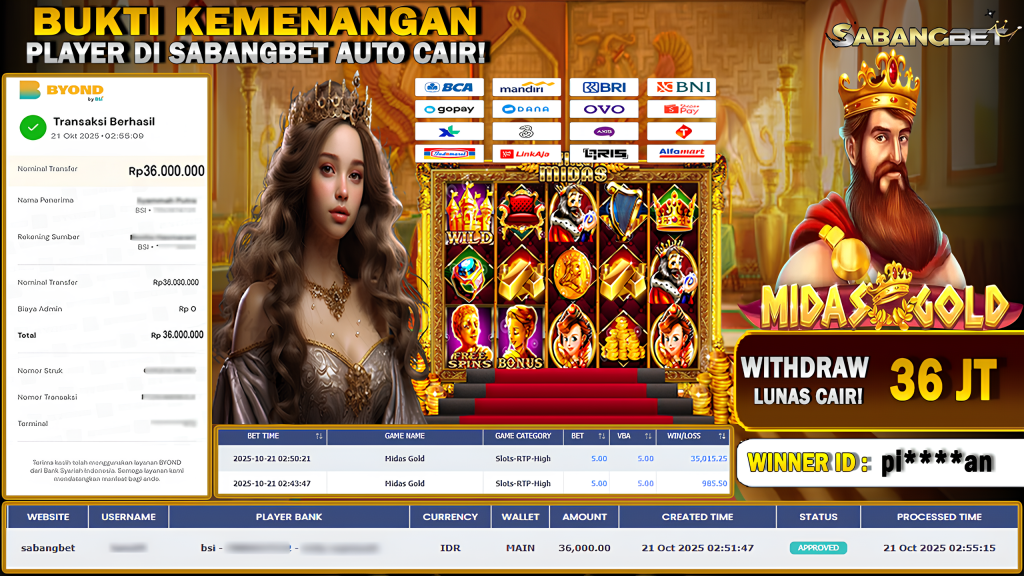 BUKTI KEMENANGAN 21 OKTOBER 2025 DI GAME MIDAS GOLD WD 22JUTA