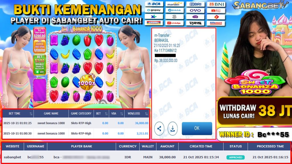 BUKTI KEMENANGAN 21 OKTOBER 2025 DI GAME SWEET BONANZA WD 38 JUTA