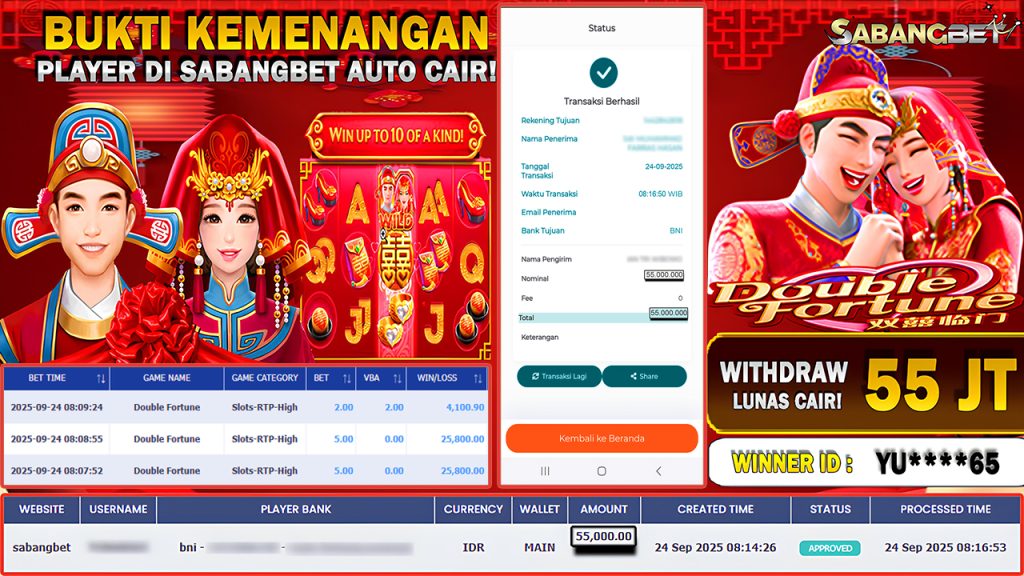 BUKTI KEMENANGAN 24 SEPTEMBER 2025 DI GAME Double Fortune WD 55 JUTA