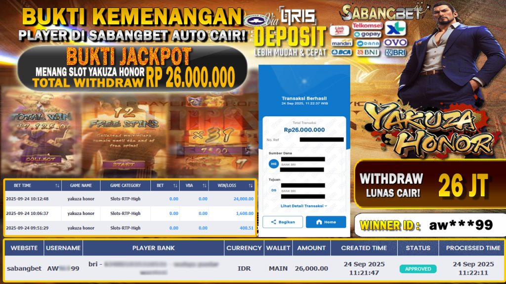 BUKTI KEMENANGAN 24 SEPTEMBER 2025 DI GAME YAKUZA HONOR WD 26 JUTA