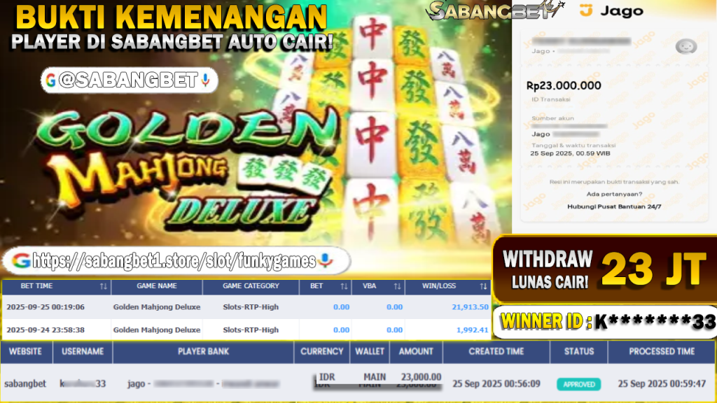 BUKTI KEMENANGAN 25 SEPTEMBER 2025 DI GAME GOLDEN MAHJONG DELUXE WD 23 JUTA
