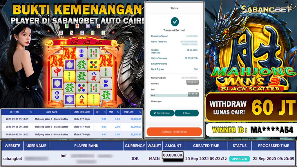 BUKTI KEMENANGAN 25 SEPTEMBER 2025 DI GAME Mahjong Wins 3 – Black Scatter WD 60 JUTA