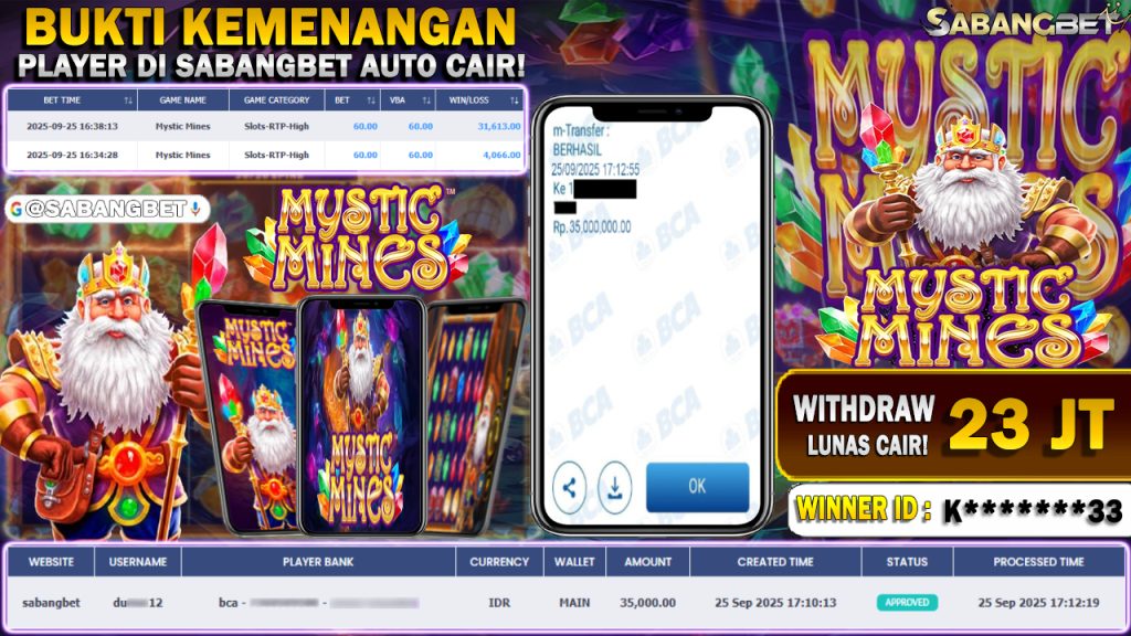 BUKTI KEMENANGAN 25 SEPTEMBER 2025 DI GAME MYSTIC MINES WD 35 JUTA