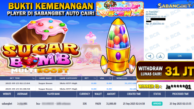 BUKTI KEMENANGAN 25 SEPTEMBER 2025 DI GAME SUGAR BOOM WD 31 JUTA