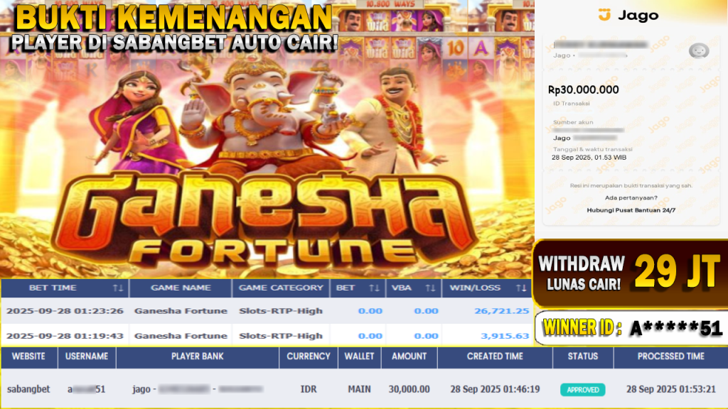BUKTI KEMENANGAN 28 SEPTEMBER 2025 DI GAME GANESHA FORTUNE WD 29 JUTA