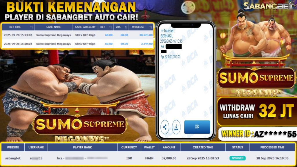 BUKTI KEMENANGAN 28 SEPTEMBER 2025 DI GAME SUMO SUPREME MEGAWAYS WD 32 JUTA